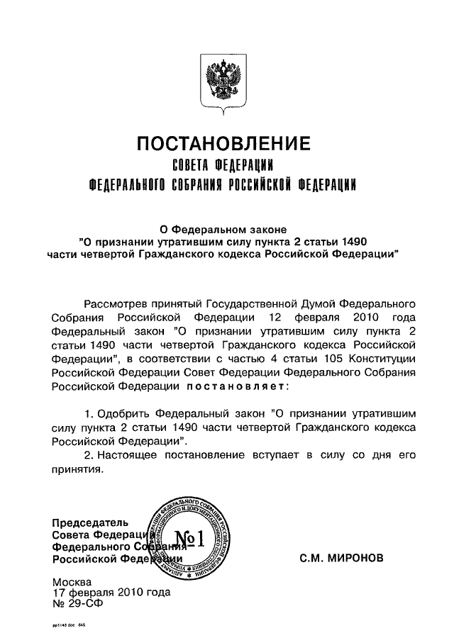ПОСТАНОВЛЕНИЕ СФ ФС РФ от 17.02.2010 N 29-СФ