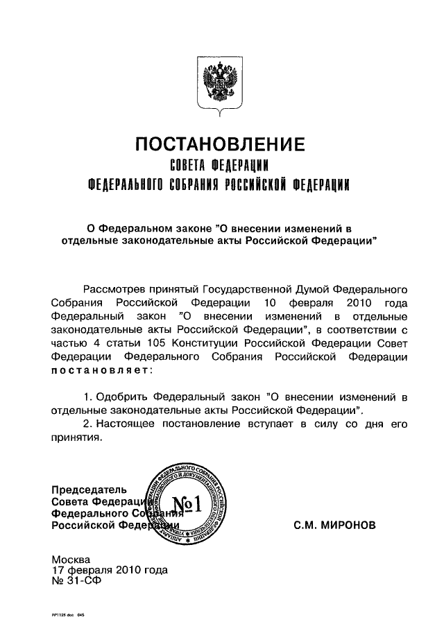 ПОСТАНОВЛЕНИЕ СФ ФС РФ от 17.02.2010 N 31-СФ