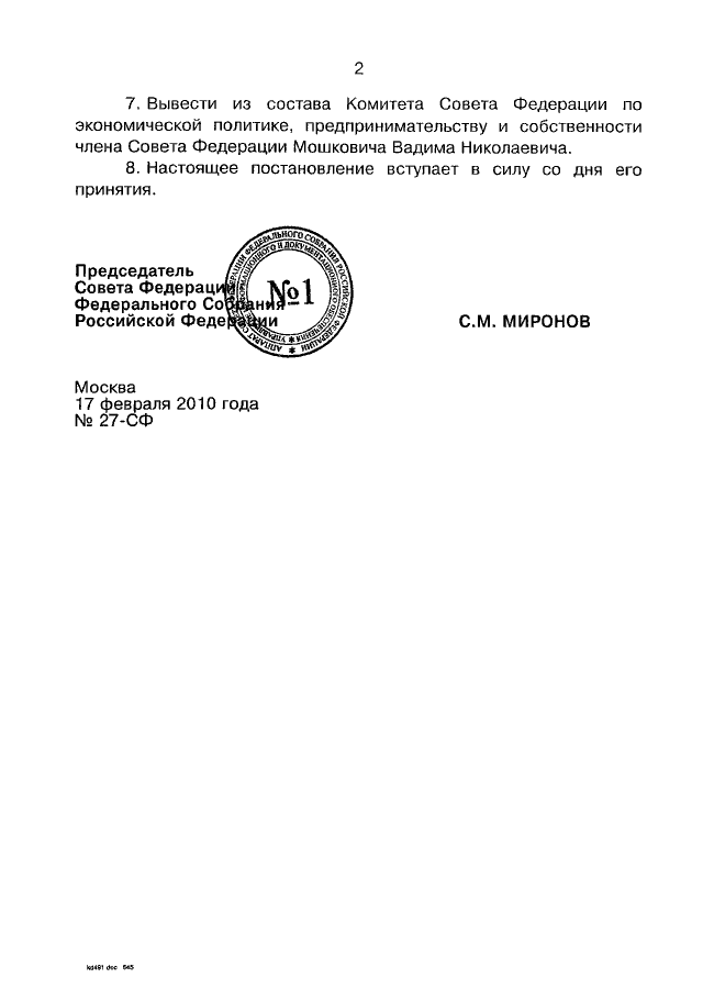 ПОСТАНОВЛЕНИЕ СФ ФС РФ от 17.02.2010 N 27-СФ
