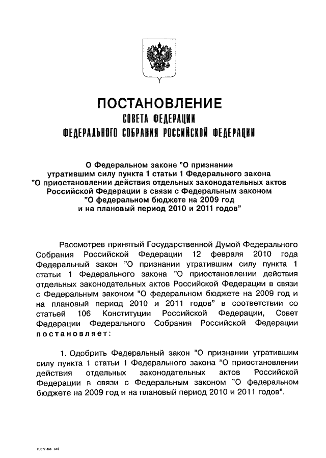 "О ФЕДЕРАЛЬНОМ ЗАКОНЕ "О ПРИЗНАНИИ УТРАТИВШИМ СИЛУ ПУНКТА 1