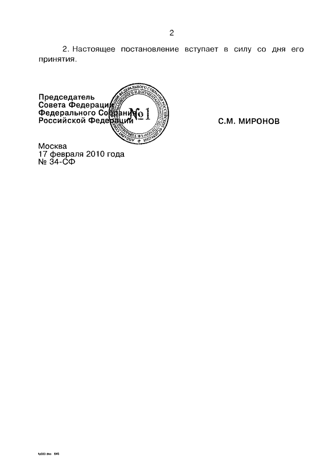 ПОСТАНОВЛЕНИЕ СФ ФС РФ от 17.02.2010 N 34-СФ