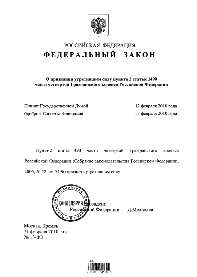 "О ПРИЗНАНИИ УТРАТИВШИМ СИЛУ ПУНКТА 2 СТАТЬИ 1490 ЧАСТИ ЧЕТВЕРТОЙ ГРАЖДАНСКОГО КОДЕКСА РОССИЙСКОЙ ФЕДЕРАЦИИ"