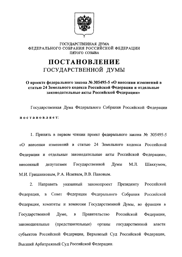 "О ПРОЕКТЕ ФЕДЕРАЛЬНОГО ЗАКОНА N 305495-5 "О ВНЕСЕНИИ ИЗМЕНЕНИЙ В СТАТЬЮ 24 ЗЕМЕЛЬНОГО КОДЕКСА РОССИЙСКОЙ ФЕДЕРАЦИИ И ОТДЕЛЬНЫЕ ЗАКОНОДАТЕЛЬНЫЕ АКТЫ РОССИЙСКОЙ ФЕДЕРАЦИИ"