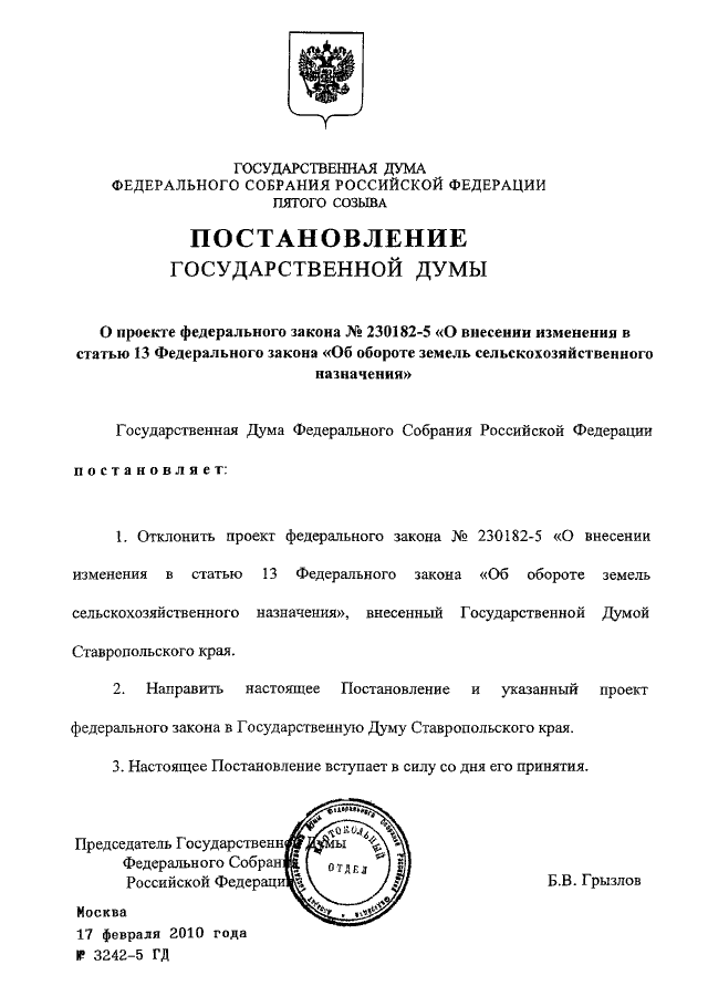 ПОСТАНОВЛЕНИЕ ГД ФС РФ от 17.02.2010 N 3242-5 ГД