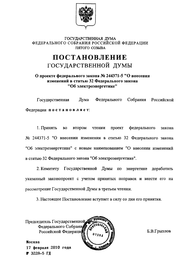 ПОСТАНОВЛЕНИЕ ГД ФС РФ от 17.02.2010 N 3228-5 ГД