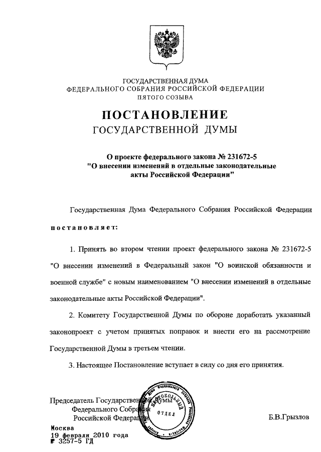 ПОСТАНОВЛЕНИЕ ГД ФС РФ от 19.02.2010 N 3257-5 ГД