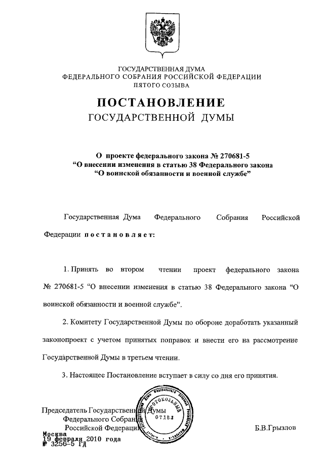 "О ПРОЕКТЕ ФЕДЕРАЛЬНОГО ЗАКОНА N 270681-5 "О ВНЕСЕНИИ ИЗМЕНЕНИЯ В СТАТЬЮ 38 ФЕДЕРАЛЬНОГО ЗАКОНА "О ВОИНСКОЙ ОБЯЗАННОСТИ И ВОЕННОЙ СЛУЖБЕ"