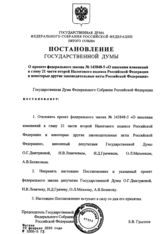 ПОСТАНОВЛЕНИЕ ГД ФС РФ от 19.02.2010 N 3265-5 ГД