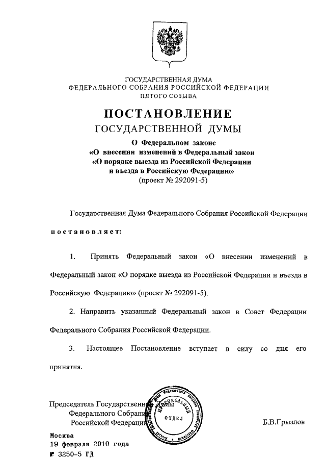 "О ФЕДЕРАЛЬНОМ ЗАКОНЕ "О ВНЕСЕНИИ ИЗМЕНЕНИЙ В ФЕДЕРАЛЬНЫЙ ЗАКОН "О ПОРЯДКЕ ВЫЕЗДА ИЗ РОССИЙСКОЙ ФЕДЕРАЦИИ И ВЪЕЗДА В РОССИЙСКУЮ ФЕДЕРАЦИЮ" (ПРОЕКТ N 292091-5)"
