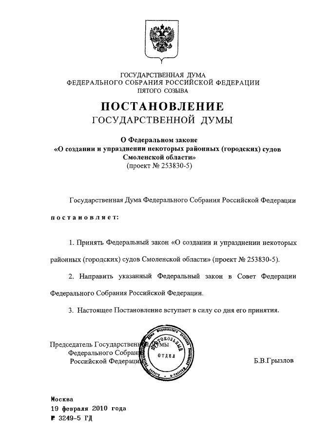 ПОСТАНОВЛЕНИЕ ГД ФС РФ от 19.02.2010 N 3249-5 ГД
