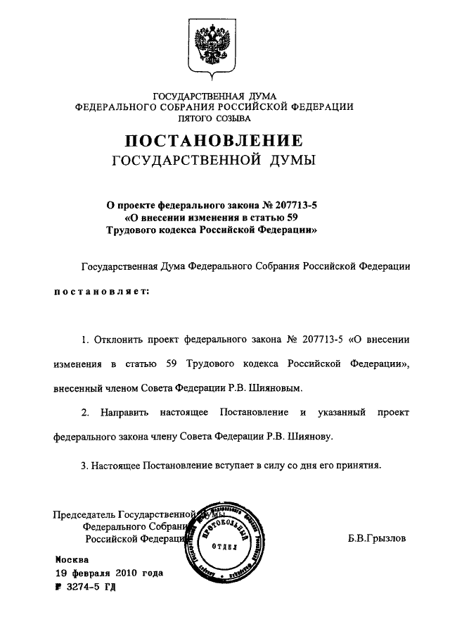 "О ПРОЕКТЕ ФЕДЕРАЛЬНОГО ЗАКОНА N 207713-5 "О ВНЕСЕНИИ ИЗМЕНЕНИЯ В СТАТЬЮ 59 ТРУДОВОГО КОДЕКСА РОССИЙСКОЙ ФЕДЕРАЦИИ"