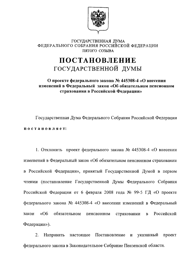 "О ПРОЕКТЕ ФЕДЕРАЛЬНОГО ЗАКОНА N 445308-4 "О ВНЕСЕНИИ ИЗМЕНЕНИЙ В ФЕДЕРАЛЬНЫЙ ЗАКОН "ОБ ОБЯЗАТЕЛЬНОМ ПЕНСИОННОМ СТРАХОВАНИИ В РОССИЙСКОЙ ФЕДЕРАЦИИ"