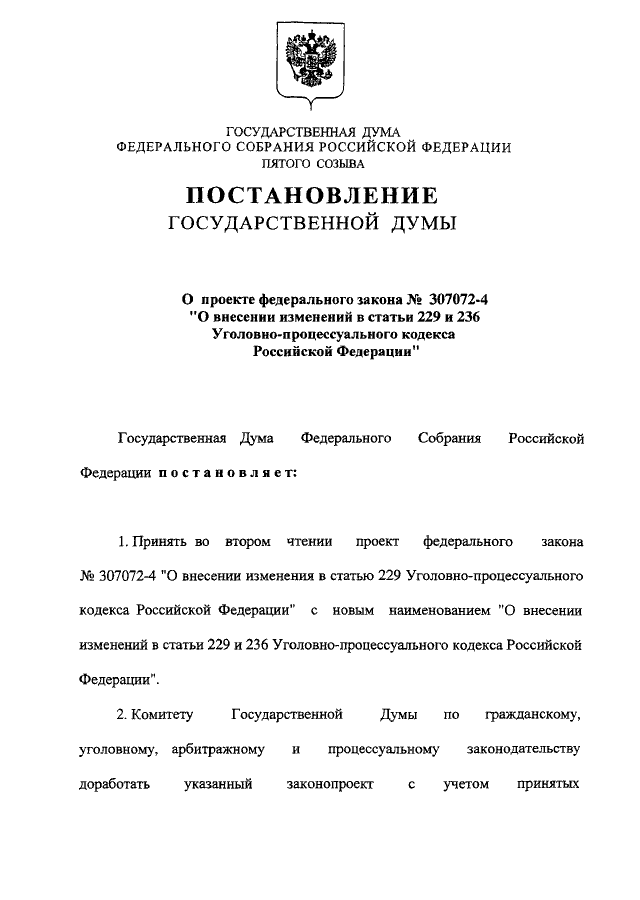 "О ПРОЕКТЕ ФЕДЕРАЛЬНОГО ЗАКОНА N 307072-4 "О ВНЕСЕНИИ ИЗМЕНЕНИЙ В СТАТЬИ 229 И 236 УГОЛОВНО - ПРОЦЕССУАЛЬНОГО КОДЕКСА РОССИЙСКОЙ ФЕДЕРАЦИИ"