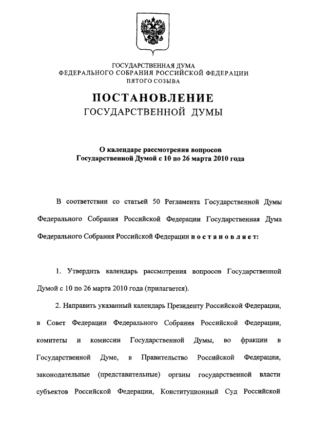 "О КАЛЕНДАРЕ РАССМОТРЕНИЯ ВОПРОСОВ ГОСУДАРСТВЕННОЙ ДУМОЙ С 10 ПО 26 МАРТА 2010 ГОДА"