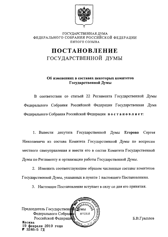ПОСТАНОВЛЕНИЕ ГД ФС РФ от 19.02.2010 N 3246-5 ГД