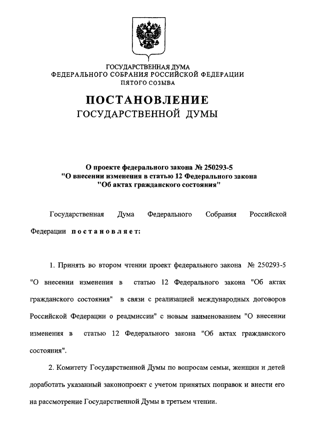 "О ПРОЕКТЕ ФЕДЕРАЛЬНОГО ЗАКОНА N 250293-5 "О ВНЕСЕНИИ ИЗМЕНЕНИЯ В СТАТЬЮ 12 ФЕДЕРАЛЬНОГО ЗАКОНА "ОБ АКТАХ ГРАЖДАНСКОГО СОСТОЯНИЯ"