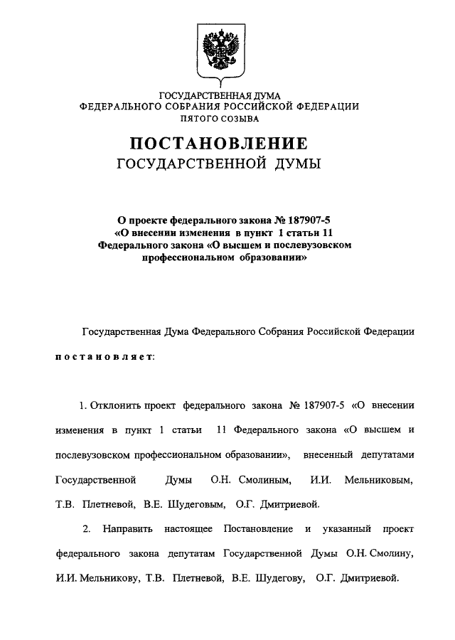 "О ПРОЕКТЕ ФЕДЕРАЛЬНОГО ЗАКОНА N 187907-5 "О ВНЕСЕНИИ ИЗМЕНЕНИЯ В ПУНКТ 1 СТАТЬИ 11 ФЕДЕРАЛЬНОГО ЗАКОНА "О ВЫСШЕМ И ПОСЛЕВУЗОВСКОМ ПРОФЕССИОНАЛЬНОМ ОБРАЗОВАНИИ"