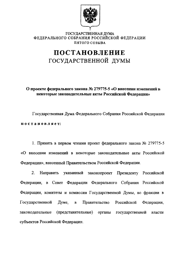 "О ПРОЕКТЕ ФЕДЕРАЛЬНОГО ЗАКОНА N 279775-5 "О ВНЕСЕНИИ ИЗМЕНЕНИЙ В НЕКОТОРЫЕ ЗАКОНОДАТЕЛЬНЫЕ АКТЫ РОССИЙСКОЙ ФЕДЕРАЦИИ"