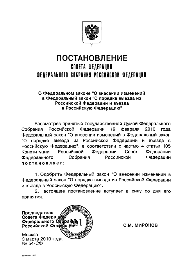 ПОСТАНОВЛЕНИЕ СФ ФС РФ от 03.03.2010 N 54-СФ