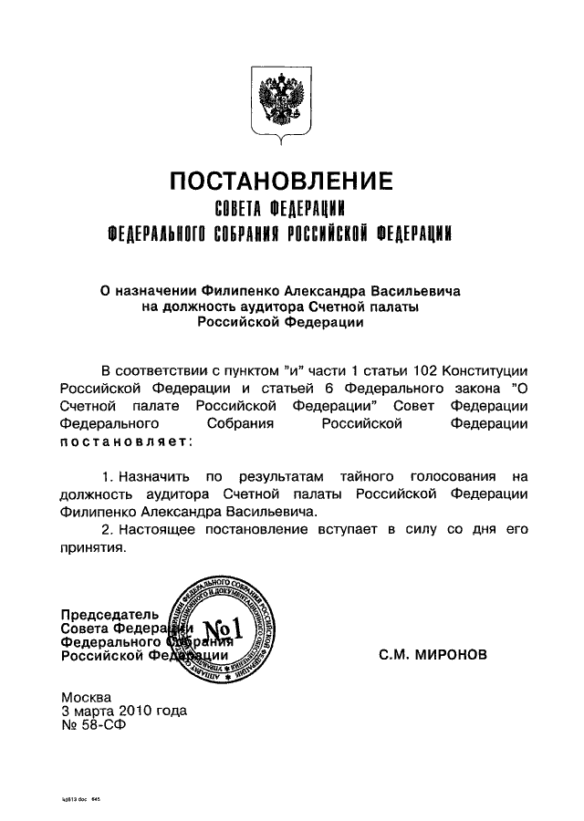 "О НАЗНАЧЕНИИ ФИЛИПЕНКО АЛЕКСАНДРА ВАСИЛЬЕВИЧА НА ДОЛЖНОСТЬ АУДИТОРА СЧЕТНОЙ ПАЛАТЫ РОССИЙСКОЙ ФЕДЕРАЦИИ"