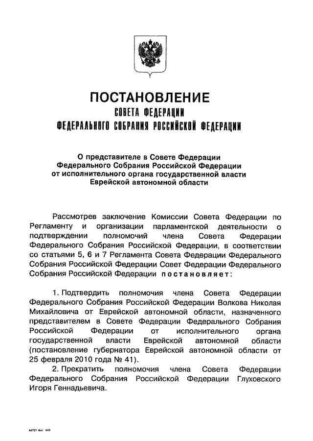 "О ПРЕДСТАВИТЕЛЕ В СОВЕТЕ ФЕДЕРАЦИИ ФЕДЕРАЛЬНОГО СОБРАНИЯ РОССИЙСКОЙ ФЕДЕРАЦИИ ОТ ИСПОЛНИТЕЛЬНОГО ОРГАНА ГОСУДАРСТВЕННОЙ ВЛАСТИ ЕВРЕЙСКОЙ АВТОНОМНОЙ ОБЛАСТИ"