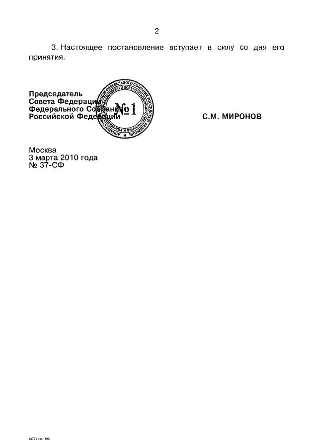 ПОСТАНОВЛЕНИЕ СФ ФС РФ от 03.03.2010 N 37-СФ