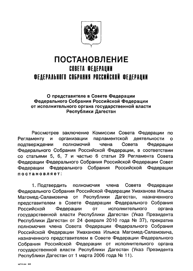 "О ПРЕДСТАВИТЕЛЕ В СОВЕТЕ ФЕДЕРАЦИИ ФЕДЕРАЛЬНОГО СОБРАНИЯ РОССИЙСКОЙ ФЕДЕРАЦИИ ОТ ИСПОЛНИТЕЛЬНОГО ОРГАНА ГОСУДАРСТВЕННОЙ ВЛАСТИ РЕСПУБЛИКИ ДАГЕСТАН"