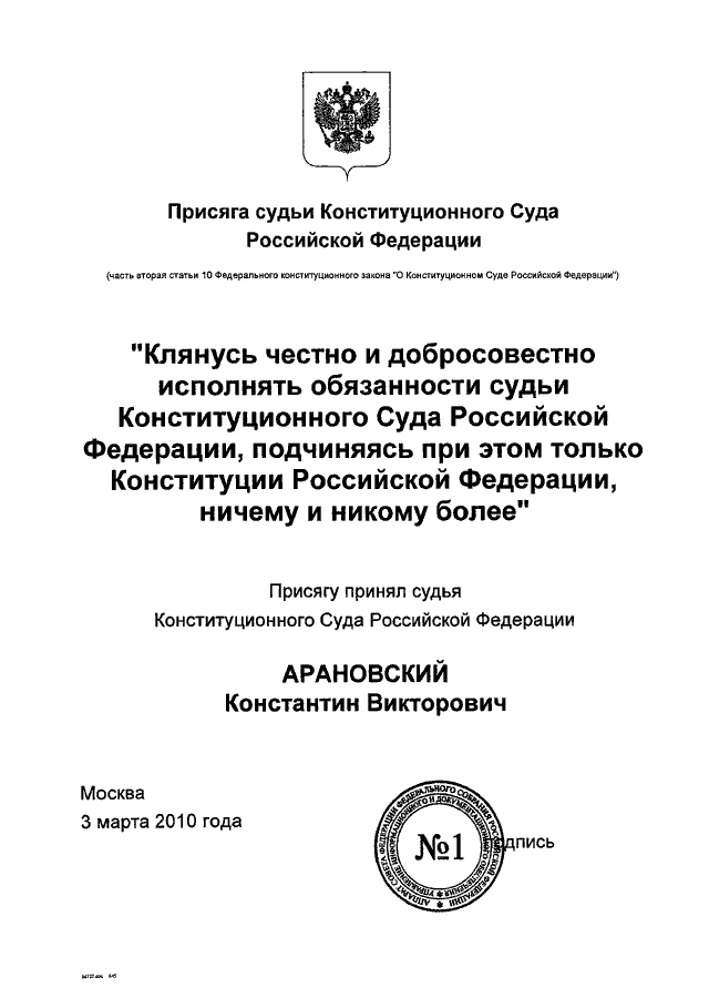 "О НАЗНАЧЕНИИ АРАНОВСКОГО КОНСТАНТИНА ВИКТОРОВИЧА НА ДОЛЖНОСТЬ СУДЬИ КОНСТИТУЦИОННОГО СУДА РОССИЙСКОЙ ФЕДЕРАЦИИ"