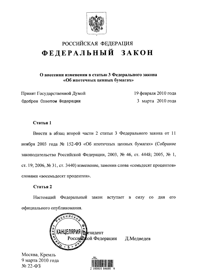 ФЕДЕРАЛЬНЫЙ ЗАКОН от 09.03.2010 N 22-ФЗ