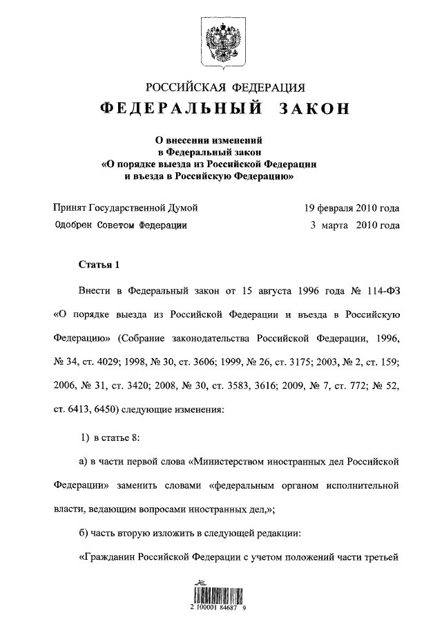 "О ВНЕСЕНИИ ИЗМЕНЕНИЙ В ФЕДЕРАЛЬНЫЙ ЗАКОН "О ПОРЯДКЕ ВЫЕЗДА ИЗ РОССИЙСКОЙ ФЕДЕРАЦИИ И ВЪЕЗДА В РОССИЙСКУЮ ФЕДЕРАЦИЮ"