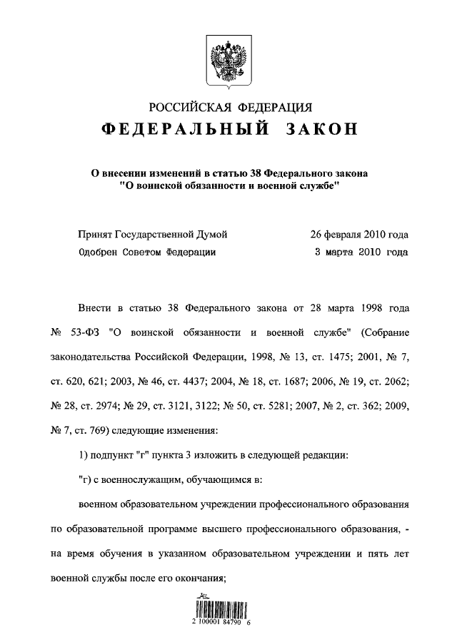 "О ВНЕСЕНИИ ИЗМЕНЕНИЙ В СТАТЬЮ 38 ФЕДЕРАЛЬНОГО ЗАКОНА "О ВОИНСКОЙ ОБЯЗАННОСТИ И ВОЕННОЙ СЛУЖБЕ"