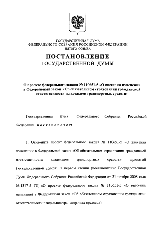 "О ПРОЕКТЕ ФЕДЕРАЛЬНОГО ЗАКОНА N 110651-5 "О ВНЕСЕНИИ ИЗМЕНЕНИЙ В ФЕДЕРАЛЬНЫЙ ЗАКОН "ОБ ОБЯЗАТЕЛЬНОМ СТРАХОВАНИИ ГРАЖДАНСКОЙ ОТВЕТСТВЕННОСТИ ВЛАДЕЛЬЦЕВ ТРАНСПОРТНЫХ СРЕДСТВ"