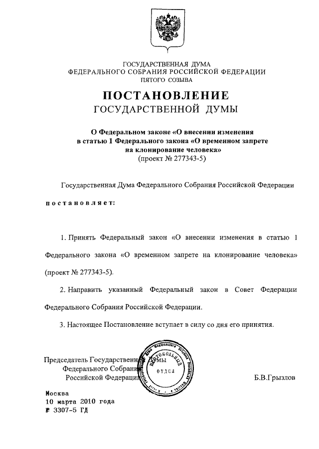 "О ФЕДЕРАЛЬНОМ ЗАКОНЕ "О ВНЕСЕНИИ ИЗМЕНЕНИЯ В СТАТЬЮ 1 ФЕДЕРАЛЬНОГО ЗАКОНА "О ВРЕМЕННОМ ЗАПРЕТЕ НА КЛОНИРОВАНИЕ ЧЕЛОВЕКА" (ПРОЕКТ N 277343-5)"