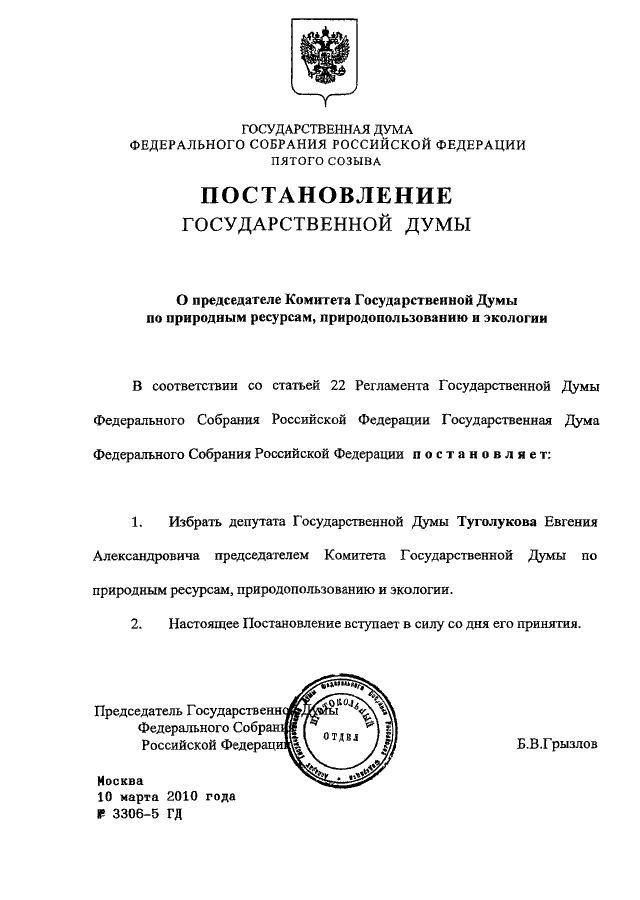 "О ПРЕДСЕДАТЕЛЕ КОМИТЕТА ГОСУДАРСТВЕННОЙ ДУМЫ ПО ПРИРОДНЫМ РЕСУРСАМ, ПРИРОДОПОЛЬЗОВАНИЮ И ЭКОЛОГИИ"