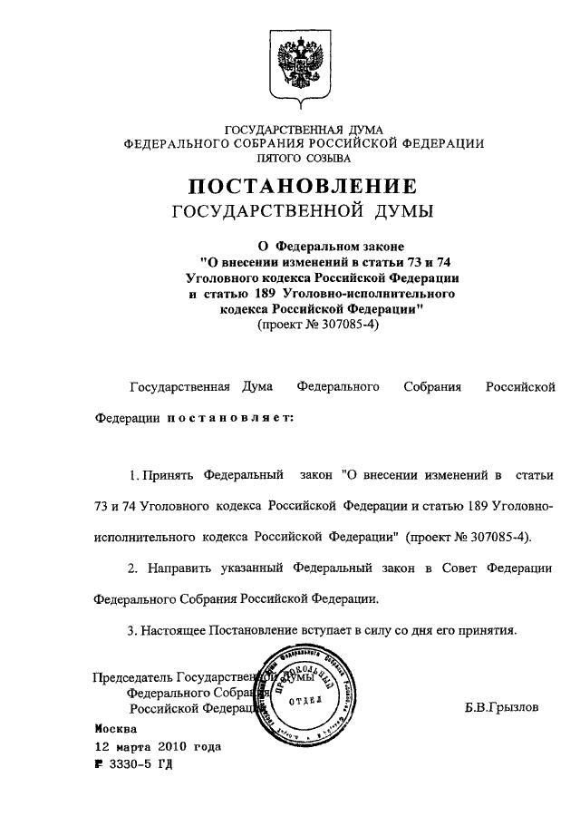 "О ФЕДЕРАЛЬНОМ ЗАКОНЕ "О ВНЕСЕНИИ ИЗМЕНЕНИЙ В СТАТЬИ 73 И 74 УГОЛОВНОГО КОДЕКСА РОССИЙСКОЙ ФЕДЕРАЦИИ И СТАТЬЮ 189 УГОЛОВНО - ИСПОЛНИТЕЛЬНОГО КОДЕКСА РОССИЙСКОЙ ФЕДЕРАЦИИ" (ПРОЕКТ N 307085-4)"