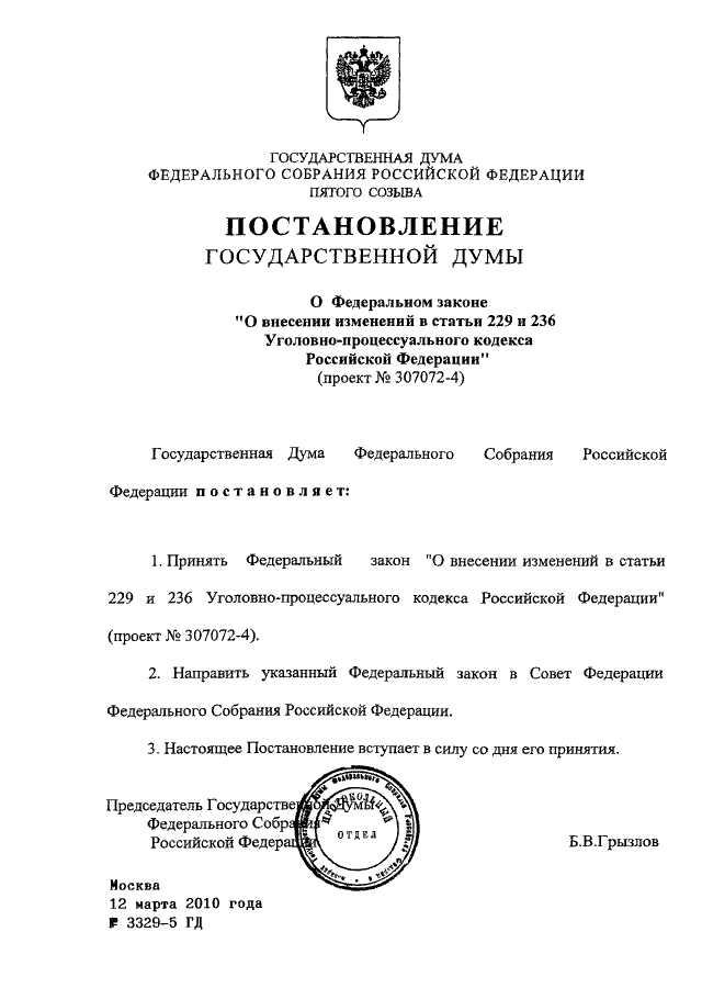 "О ФЕДЕРАЛЬНОМ ЗАКОНЕ "О ВНЕСЕНИИ ИЗМЕНЕНИЙ В СТАТЬИ 229 И 236 УГОЛОВНО - ПРОЦЕССУАЛЬНОГО КОДЕКСА РОССИЙСКОЙ ФЕДЕРАЦИИ" (ПРОЕКТ N 307072-4)"