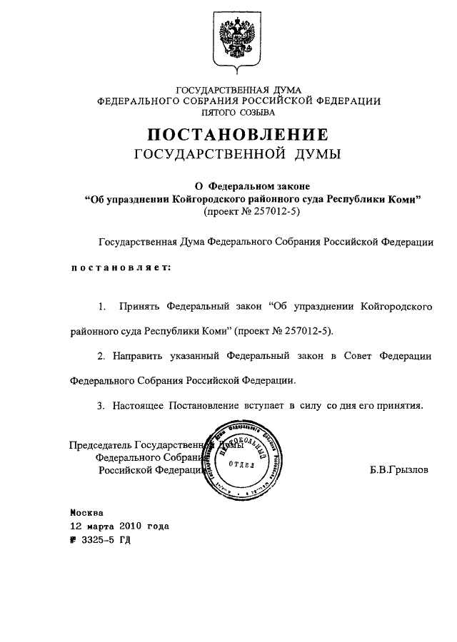 "О ФЕДЕРАЛЬНОМ ЗАКОНЕ "ОБ УПРАЗДНЕНИИ КОЙГОРОДСКОГО РАЙОННОГО СУДА РЕСПУБЛИКИ КОМИ" (ПРОЕКТ N 257012-5)"