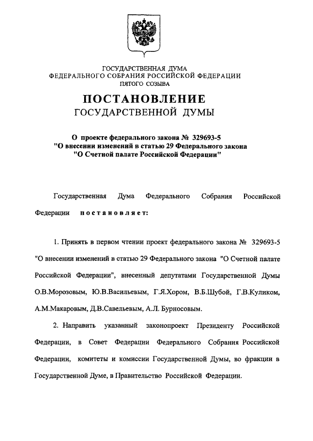 "О ПРОЕКТЕ ФЕДЕРАЛЬНОГО ЗАКОНА N 329693-5 "О ВНЕСЕНИИ ИЗМЕНЕНИЙ В СТАТЬЮ 29 ФЕДЕРАЛЬНОГО ЗАКОНА "О СЧЕТНОЙ ПАЛАТЕ РОССИЙСКОЙ ФЕДЕРАЦИИ"