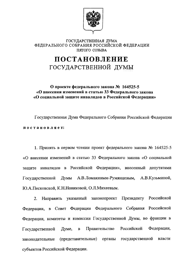 "О ПРОЕКТЕ ФЕДЕРАЛЬНОГО ЗАКОНА N 164525-5 "О ВНЕСЕНИИ ИЗМЕНЕНИЙ В СТАТЬЮ 33 ФЕДЕРАЛЬНОГО ЗАКОНА "О СОЦИАЛЬНОЙ ЗАЩИТЕ ИНВАЛИДОВ В РОССИЙСКОЙ ФЕДЕРАЦИИ"