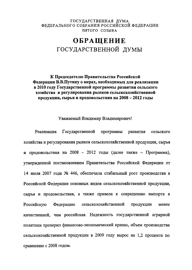 "ОБ ОБРАЩЕНИИ ГОСУДАРСТВЕННОЙ ДУМЫ ФЕДЕРАЛЬНОГО СОБРАНИЯ РОССИЙСКОЙ ФЕДЕРАЦИИ "К ПРЕДСЕДАТЕЛЮ ПРАВИТЕЛЬСТВА РОССИЙСКОЙ ФЕДЕРАЦИИ В.В. ПУТИНУ О МЕРАХ, НЕОБХОДИМЫХ ДЛЯ РЕАЛИЗАЦИИ В 2010 ГОДУ ГОСУДАРСТВЕННОЙ ПРОГРАММЫ РАЗВИТИЯ СЕЛЬСКОГО ХОЗЯЙСТВА И РЕГУЛИРОВАНИЯ РЫНКОВ СЕЛЬСКОХОЗЯЙСТВЕННОЙ ПРОДУКЦИИ, СЫРЬЯ И ПРОДОВОЛЬСТВИЯ НА 2008 - 2012 ГОДЫ"