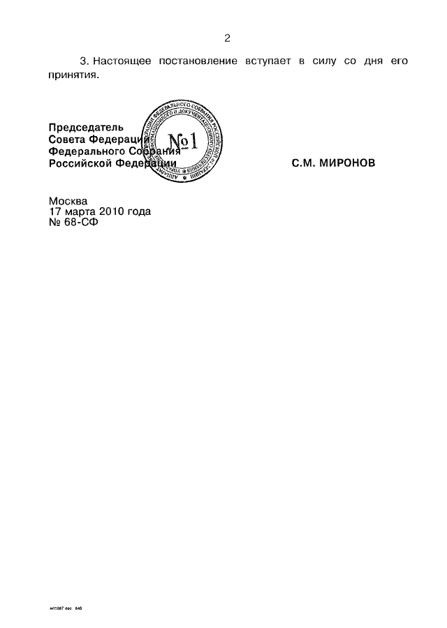 ПОСТАНОВЛЕНИЕ СФ ФС РФ от 17.03.2010 N 68-СФ