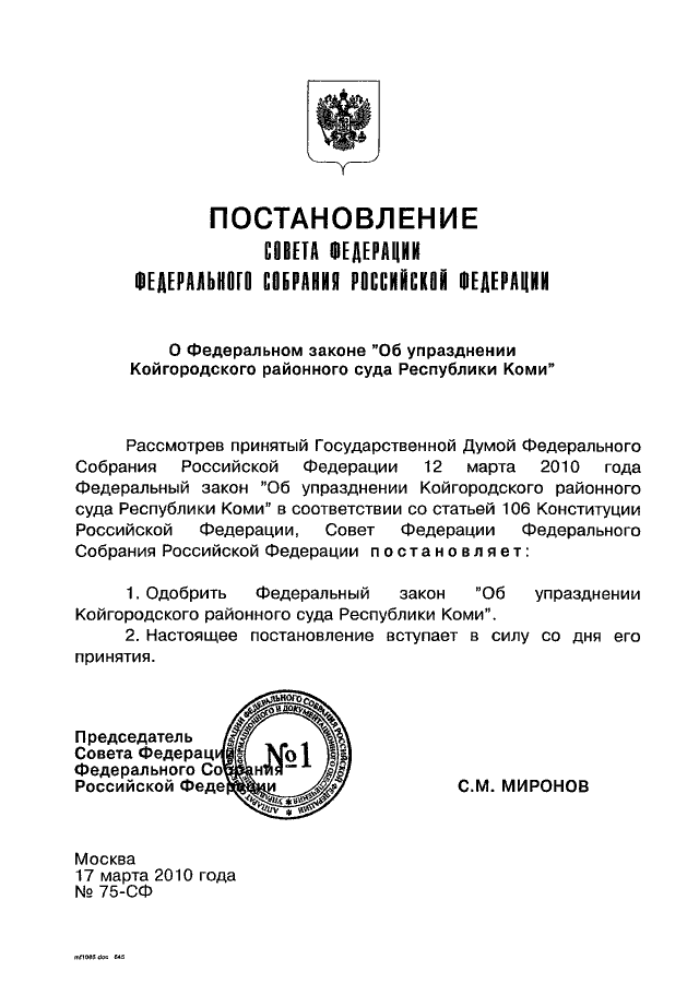 ПОСТАНОВЛЕНИЕ СФ ФС РФ от 17.03.2010 N 75-СФ