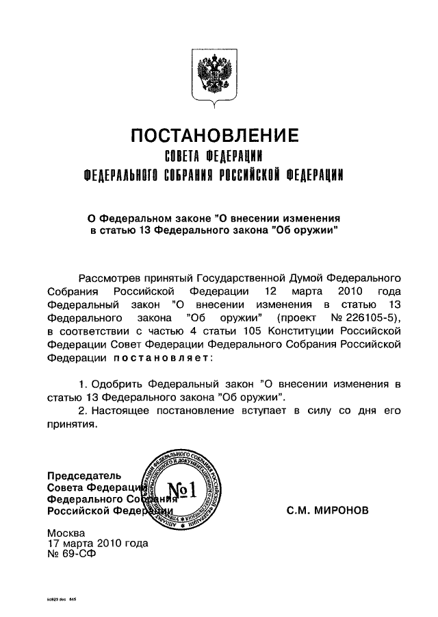 ПОСТАНОВЛЕНИЕ СФ ФС РФ от 17.03.2010 N 69-СФ