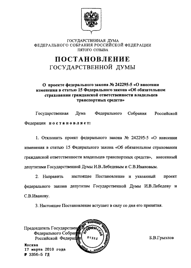ПОСТАНОВЛЕНИЕ ГД ФС РФ от 17.03.2010 N 3356-5 ГД