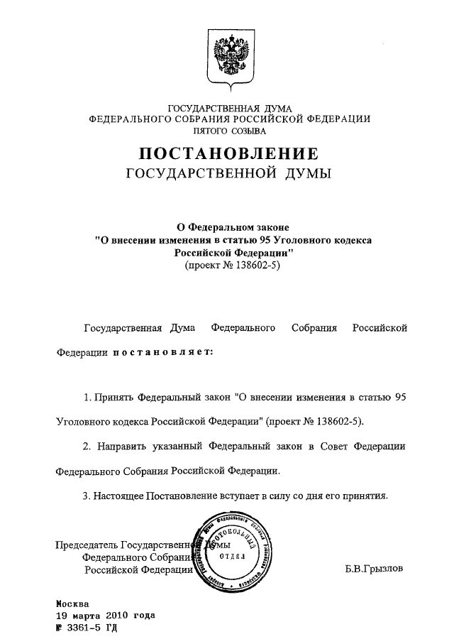 "О ФЕДЕРАЛЬНОМ ЗАКОНЕ "О ВНЕСЕНИИ ИЗМЕНЕНИЯ В СТАТЬЮ 95 УГОЛОВНОГО КОДЕКСА РОССИЙСКОЙ ФЕДЕРАЦИИ" (ПРОЕКТ N 138602-5)"