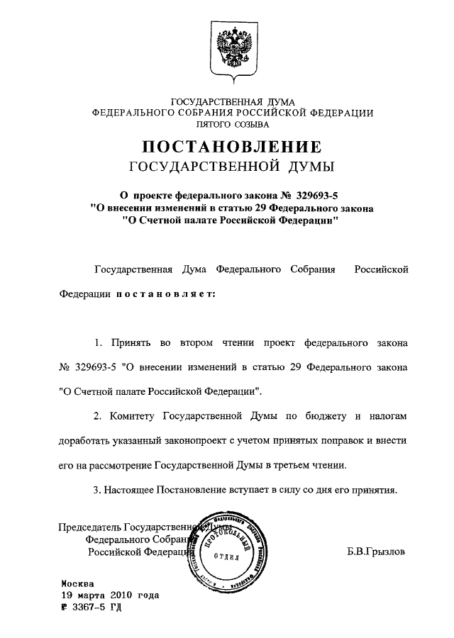 ПОСТАНОВЛЕНИЕ ГД ФС РФ от 19.03.2010 N 3367-5 ГД