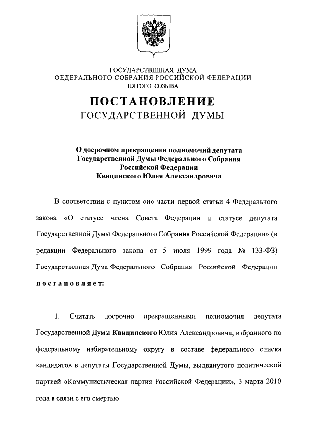 "О ДОСРОЧНОМ ПРЕКРАЩЕНИИ ПОЛНОМОЧИЙ ДЕПУТАТА ГОСУДАРСТВЕННОЙ ДУМЫ ФЕДЕРАЛЬНОГО СОБРАНИЯ РОССИЙСКОЙ ФЕДЕРАЦИИ КВИЦИНСКОГО ЮЛИЯ АЛЕКСАНДРОВИЧА"