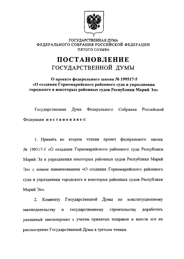 "О ПРОЕКТЕ ФЕДЕРАЛЬНОГО ЗАКОНА N 199517-5 "О СОЗДАНИИ ГОРНОМАРИЙСКОГО РАЙОННОГО СУДА И УПРАЗДНЕНИИ ГОРОДСКОГО И НЕКОТОРЫХ РАЙОННЫХ СУДОВ РЕСПУБЛИКИ МАРИЙ ЭЛ"