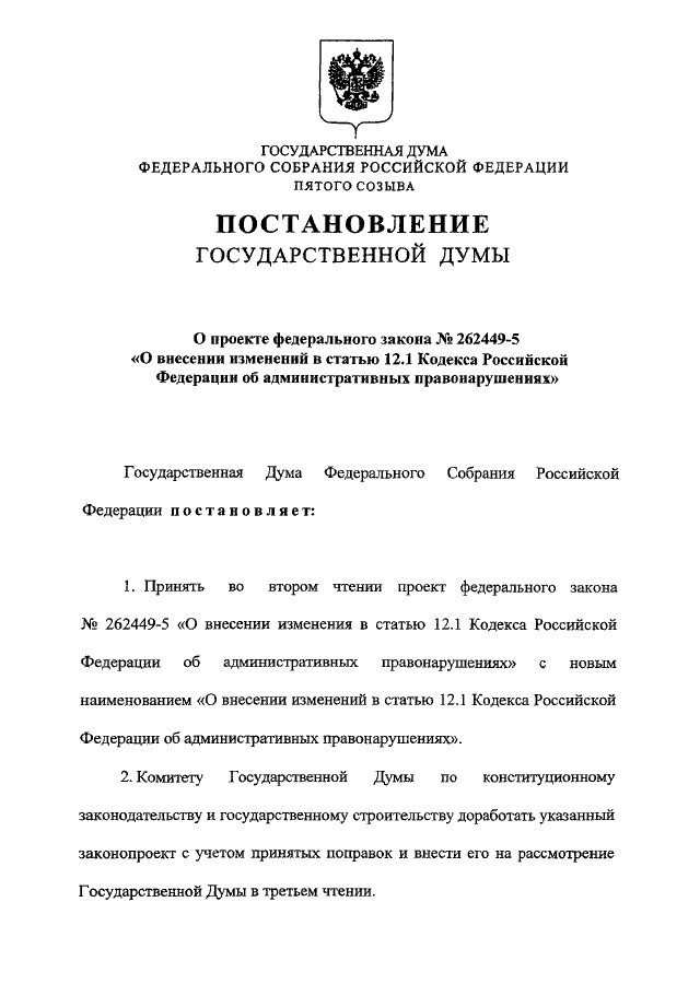 "О ПРОЕКТЕ ФЕДЕРАЛЬНОГО ЗАКОНА N 262449-5 "О ВНЕСЕНИИ ИЗМЕНЕНИЙ В СТАТЬЮ 12.1 КОДЕКСА РОССИЙСКОЙ ФЕДЕРАЦИИ ОБ АДМИНИСТРАТИВНЫХ ПРАВОНАРУШЕНИЯХ"