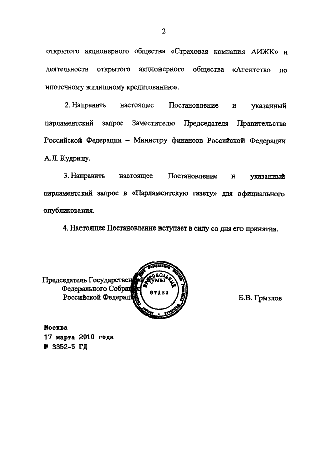 ПОСТАНОВЛЕНИЕ ГД ФС РФ от 17.03.2010 N 3352-5 ГД